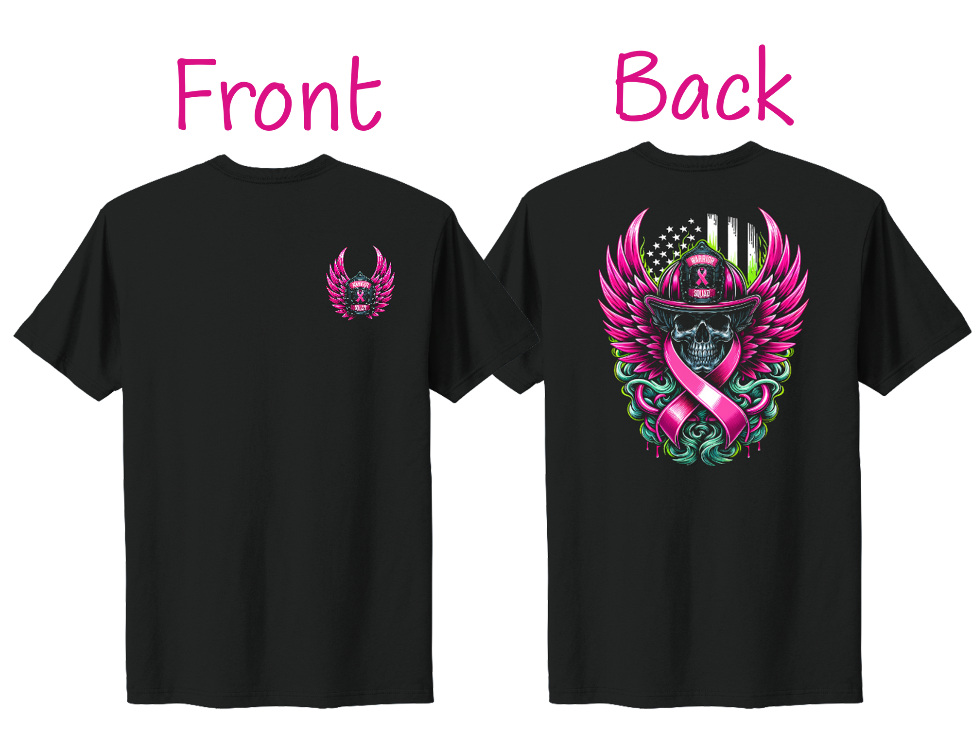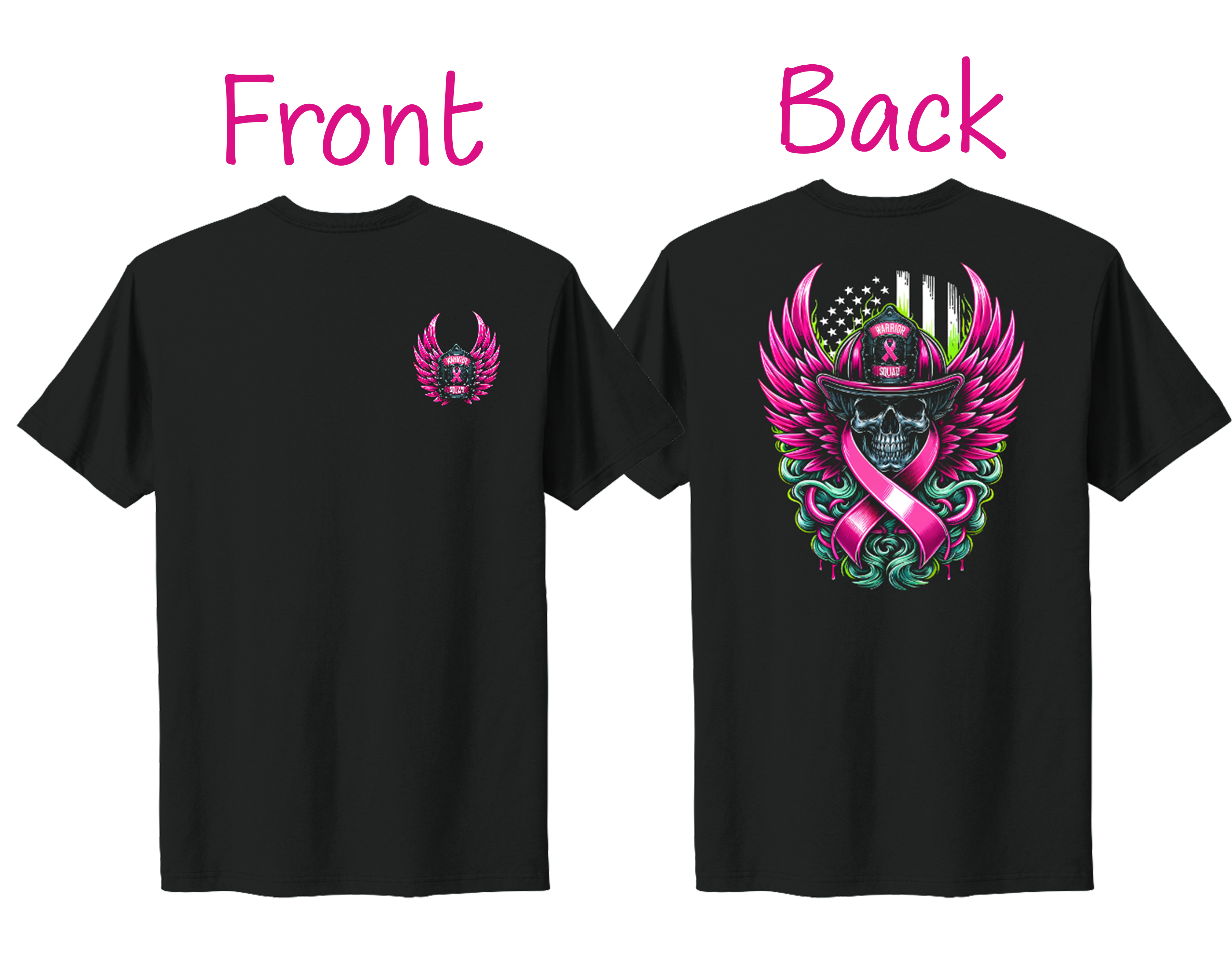 Show your strength and support with this bold tee featuring a firefighter skull, pink ribbon, and wings over a distressed American flag. Crafted from soft cotton for comfort and durability, it’s perfect for awareness events or everyday wear. Join the Warrior Squad and stand proud in the fight against breast cancer.